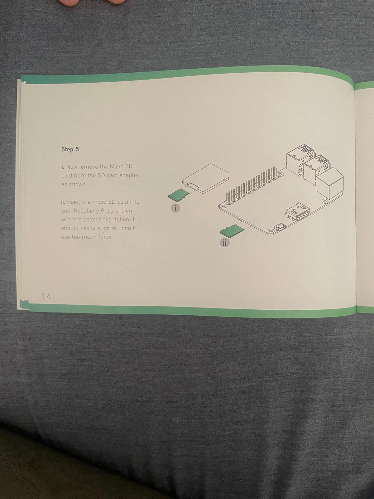 il. Insert the micro SD card into your Raspberry Pi as shown with the correct orientation. It should easily slide in.”